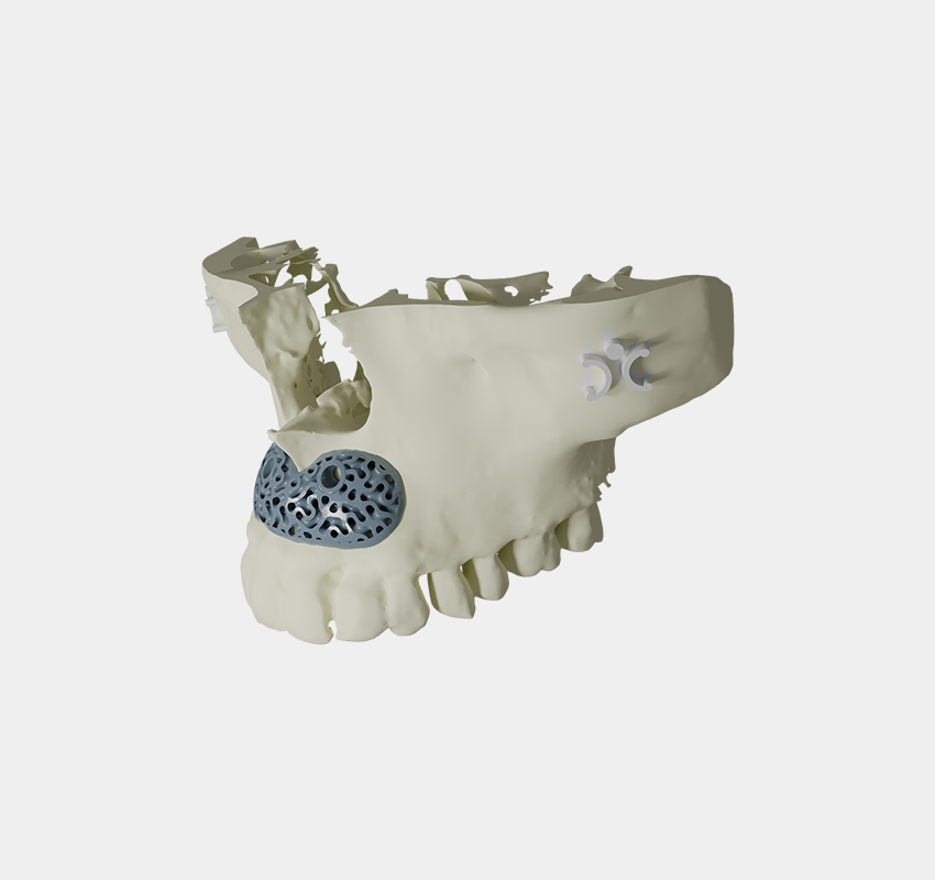 Özel tasarlanmış titanyum iskelet, dental implant uygulanamayan bireylerde kemik artırımı için kullanılır. Bilgisayar destekli tasarım ve 3D baskı ile üretilen bu iskelet, kemik greftlerinin eklenmesiyle kemik oluşumunu destekleyerek bariyer görevi görür.